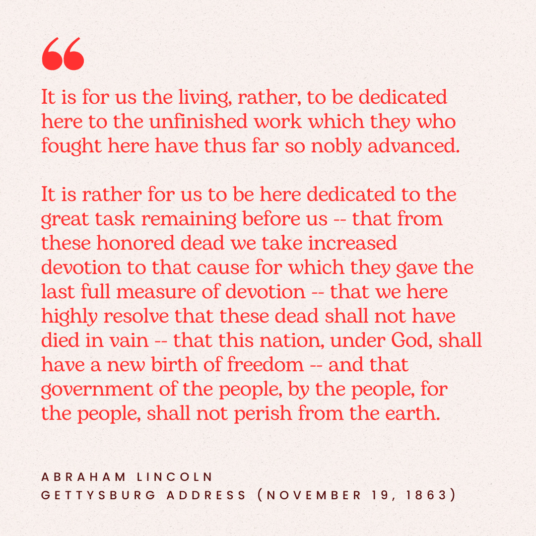 The world must note what was said on that battleground over 160 years ago. We must too remember what was done there to consecrate that ground. Government can only be for the people if it is also of the people and by the people. We must let the people library. We must remember (and answer) the calls to build, to restore, and to governance together.
